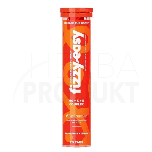 DuoLife Boost Formula FIZZY EASY Mg + K + B COMPLEX jsou šumivé tablety k přípravě osvěžujícího nápoje s ovocnou příchutí (malinovo-citronová příchuť).
